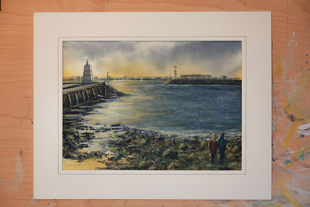 I don't really do sunsets in watercolour as I feel it's better suited for an opaque medium such as oils or acrylics but looking through my photographs I came across one I took last November at the Headland in Hartlepool so I thought that I would give it a try.